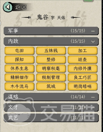 接下来是通关的关键能力点。武艺的提升一定不要急于追求高爆发,而是稳步推进,先达到90左右后,通过缉拿任务可以稳定刷到强力技能,几乎无敌。内政能力方面,初期的建筑如果能够提高一些,会让你在后期做将军任务时省不少事,成功率自然也高。至于文才,除非是走谋士路线,否则普通的任务和活动就让诸葛亮帮忙处理即可,顶着也能行。军事能力中,先学连射和箭雨是最为实用的,尤其是在战场上,提前布置好阵型可以大大提高打击效果。