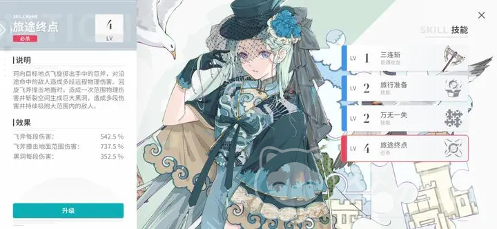 必杀技”旅途终点”,想对手飞旋投掷巨斧,沿途命中的敌方单位均受到多段远程物理损伤,回旋飞斧撞击地面,造成一次范围物理伤害,并斩裂空间生成巨大黑洞,打出多段伤害,并持续吸附大范围的敌方。