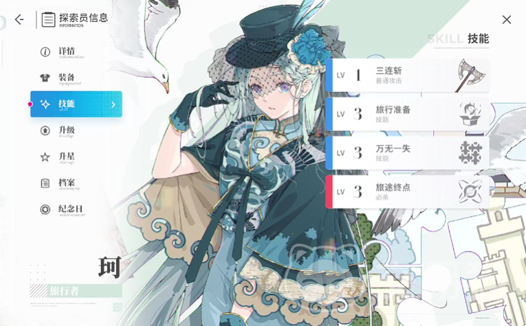 她是水属性的打击定位角色,擅长使用巨斧的武器,见识广博,好学问,在未突破之前,不论是攻击力还是防御力的数值都非常可观。普攻“三连斩”,可使用巨斧对敌人造成三段伤害。技能1”旅行准备”,投掷出随身带着的行李箱,行李箱落地时打开,同时释放其中的小型黑洞,对周围的对手造成持续的牵引,详细打开期间内再次使用该技能,可关闭回收行李箱,对周围的敌人造成一次伤害,同时将敌人向自己方向击飞,之后也能够行李箱挥击地方,敌人受到近战打击属性伤害。