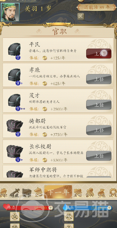 升官速度则需要玩家,根据自己的年龄进行选择,当玩家抵达25岁之前,必须要完成首次升官,随后才可以使用太守的权限,进行城池的攻略,最后不断升官,加大统一进度。