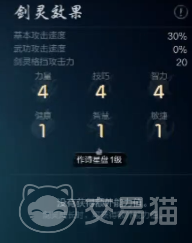 这剑灵的话可以带来高额的基础属性加成,首先佩戴上它之后就可以获得30%的攻击速度。然后格挡方面的攻击力也会提升20%,所以用了它之后。能让你的基础作战能力提升一个台阶,然后力量,技巧,智慧都会提升四点,更加均衡。