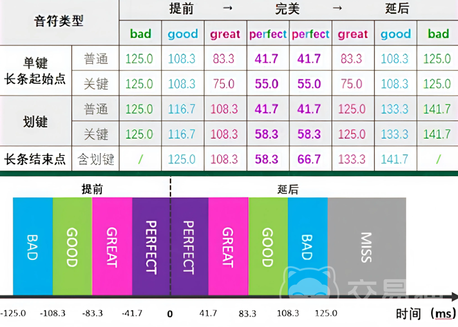 如图所示,这是具体的音符判定范围或者说区间,看着有点密密麻麻,其实大家只要记住2点,1个事黄键的“完美perfect”判定区间是要比普通按键久的。