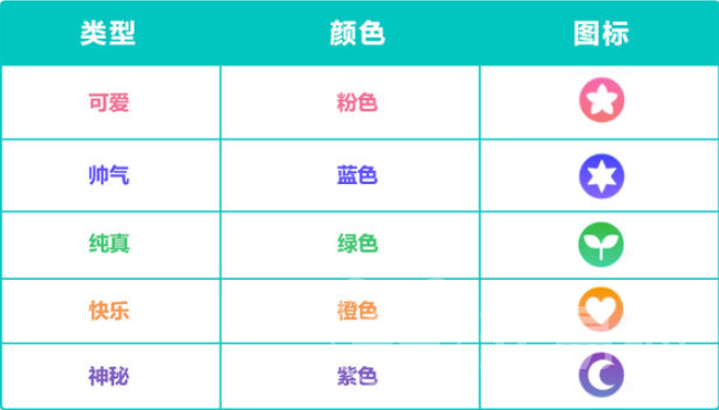 每一名成员都被赋予了5种类型的其中一种,类型图标在成员完整图的右上角或缩略图的左上角可以显示。具体对应的颜色与类型如下,“可爱”对应着粉色,“帅气”对应蓝色,”纯真”对应绿色,“快乐”对应着橙色,“神秘”对应紫色,这五种类型还有各自的图标,大家也可以参考上图。