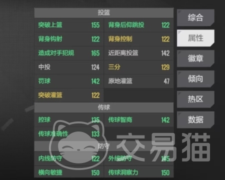 在属性达到20级6突的时候,他的各项数据更是亮眼,其中突破上蓝的能力值达到了155,这意味着他在突破到篮下时的上篮成功率相当可观,背身后仰跳投的能力值为122,这显示了他在进行背身单打时的后仰跳投技巧,很难被对手封盖,中投能力值达到了124,说明他在中距离区域的投篮命中率较高,是一个可靠的中距离射手,三分球能力值也有129,这表明他在外线也具备一定的三分远投能力,能够为球队拉开空间。