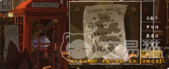 放假来到车站之后和保安亭汪汪对话,查看边上的海报,然后获得订购电话。和水果店老板对话,获得订货清单。来到电话亭打电话询问清单,在识别之后把清单交给老板,然后上车。
