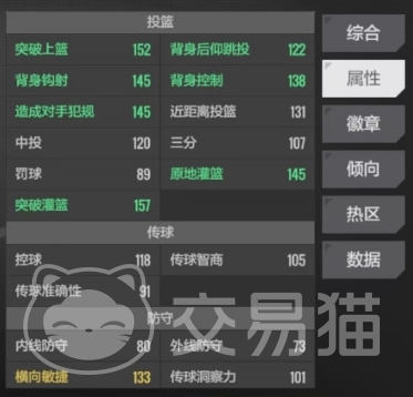当然如果他偶尔客串中锋位置,那就需要更多地依靠自身出色的属性和独特的徽章所带来的优势了,他的热区还是比较明显的,锡安在投篮属性方面就光突破上篮这一项,他的数值达到了152,这意味着他在持球快速冲击篮筐时,能够凭借强大的身体素质以极高的概率完成得分,背身后仰跳投也有122的数值,显示出他在面对防守压力时,依然有能力通过巧妙的后仰动作避开防守,将球稳稳地送入篮筐。