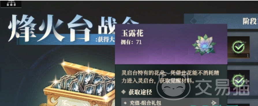 除了三山壁之外,还有合计24个常驻抽以及42个玉露花,这些奖励无疑是非常诱人的,但需要注意的是除了三山壁,其余奖励并不会一次性全部给到玩家手中,而是需要玩家通过自己的努力,通关对应的关卡层数才能逐步获得,这个烽火战令与游戏中的烽火台玩法相关,大家可以把烽火台玩法想象成一种爬塔模式,它总共有100层。