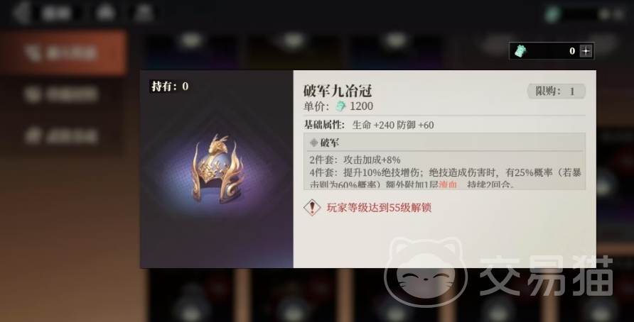 以具体的装备为例,比如红翎铜盔,玩家需要花费300灵犀玉才能购买,它可以为武将带来生命+168、防御+24的基础属性加成,然而此类相对低级的头盔并不附带技能,而像破军九冶冠,这类单价高的头盔,不仅有基础的生命以及防御加成,还有套装加成,2件套是攻击加成+8%,4件套是提升10%绝技增伤,绝技造成伤害时,有25%概率额外附加1层流而持续2回合,不过此类带有技能效果的头盔是要55级之后才可以装备的。