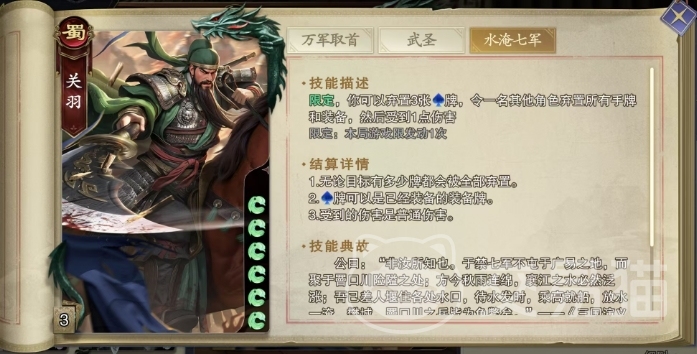 除了上述两个技能外,关羽还拥有一项名为水淹七军的限定技,这项技能允许关羽弃置三张水属性的牌,以强制一名其他角色弃置其所有的手牌和装备,并额外承受一点普通伤害,然而这项技能的发动条件相对苛刻,需要关羽手中恰好握有足够的水属性牌,而且一旦使用本局游戏中便无法再次触发,尽管如此,水淹七军在特定场合下仍能发挥出意想不到的效果,尤其是当面对装备精良或手牌充裕的对手时,一次成功的水淹七军往往能瞬间改变战局。