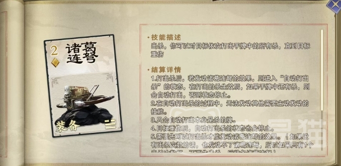 关羽的武圣技能,虽赋予了他将装备牌转化为杀打出的能力,但这一转化并非无条件的,在诸多装备中,诸葛连弩以其独特的自动触发机制而著称,然而它并不受武圣技能的影响,即便关羽装备了此弩,也无法通过武圣技能将其当作杀一并打出,这是因为诸葛连弩的设计初衷,是在于其能够自动且连续地打出所有原本即为杀属性的手牌,与武圣技能所转化的非原生杀属性牌并无直接关联。