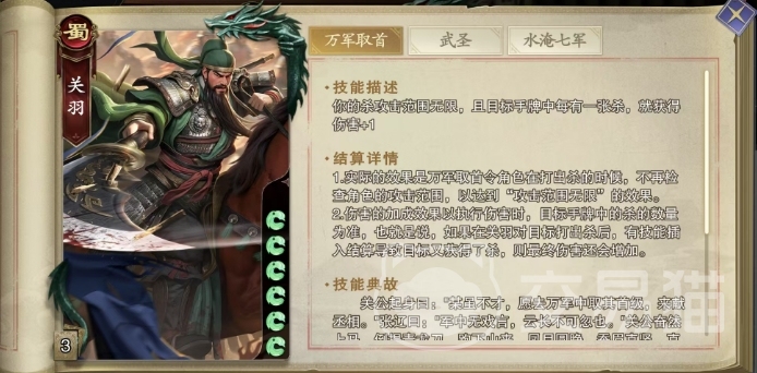 万军取首这一技能赋予了关羽前所未有的攻击范围与伤害加成能力,在战场上关羽一旦发起杀攻击,便不再受传统意义上的攻击范围限制,仿佛能够跨越千军万马,直取敌将首级,更为恐怖的是,当关羽挥舞青龙偃月刀时,目标手牌中的每张杀都会成为他力量的加成,使得原本单一的攻击瞬间变得威力倍增,这意味着面对关羽的攻势,敌人手中的杀不再是简单的防御手段,即便在杀结算过程中,有其他技能插入导致目标额外获得杀,关羽也能毫不费力地将这些新增的杀转化为更高的伤害,让对手防不胜防。