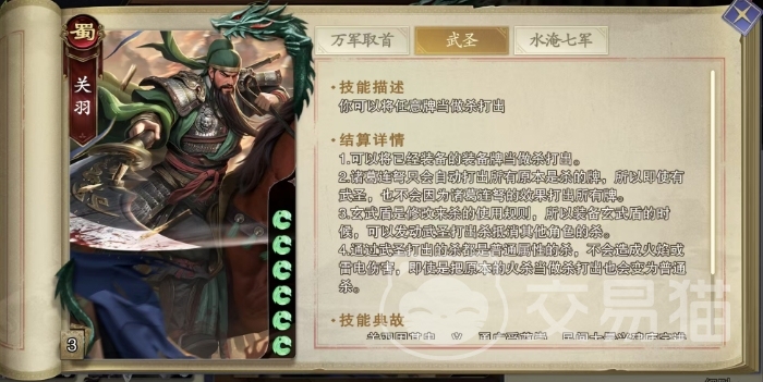 所以大家可以考虑玄武盾,这件装备则在一定程度上与武圣技能形成了巧妙的配合,当关羽装备玄武盾时,他可以利用武圣技能,将其他属性的牌转化为普通杀来抵消敌方的攻击,这种转化体现了关羽在战场上的灵活应变,值得注意的是通过武圣技能打出的杀,无论其原型为何,最终都只会被视为普通属性的杀,这意味着即便是原本带有火焰或雷电属性的杀,在经过武圣技能的转化后,也会失去其原有的特殊效果,变为最基础的攻击手段。