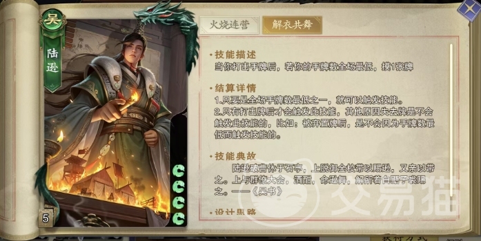 而解衣共舞这一技能,则是陆逊灵活应变的效果体现,每当陆逊打出一张手牌后,游戏都会自动检测他当前的手牌数量是否为全场最低,若是陆逊便能即刻触发此技能,从牌堆中摸取一张新牌,为自己后续的行动提供更多的可能性,这一设计不仅考验着玩家对局势的精准判断,更要求玩家在出牌时就要考虑到后续的手牌变化,真正做到每一步都深思熟虑,值得注意的是只有当陆逊主动打出牌后才能触发此技能。