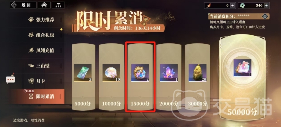除了常规的商店购买之外,限时累消活动也为玩家提供了一个获取枭山魂珠的机会,在这个特定的活动期间,玩家通过消费积累积分,当当前的消费积分达到15000分这一标准时,就可以获得两个枭山魂珠作为奖励,尽管一次性奖励的数量不多,但相较于商店限购来说,这种方式更加经济实惠,按照当前的氪金比例换算下来,玩家大约需要花费1500元才能获得这样的奖励,性价比颇高。