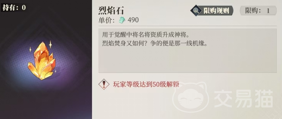烈焰石是实现将名将资质从中级提升至神级的关键所在,要想获得枭之歌烈焰石并非易事,它有着严格的获取条件和规则,首先玩家的等级需要达到50级,这才刚刚满足获取该道具的基础门槛,当玩家达到这一等级要求后,还需要花费一定数量的灵犀玉来购买烈焰石,单价设定为490灵犀玉,而且这还不是可以无限制购买的,而是进行限购。