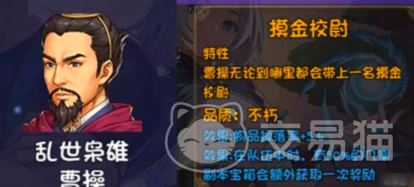 曹操的特性和被动是他的强势原因,曹操无论到哪里都会带上一位摸金校尉,相当于额外增加一个输出位置,并且当曹操在队伍中时,就会使自己的队伍有一半概率副本宝箱会额外获取一次奖励,可以帮助玩家更快地积累资源。