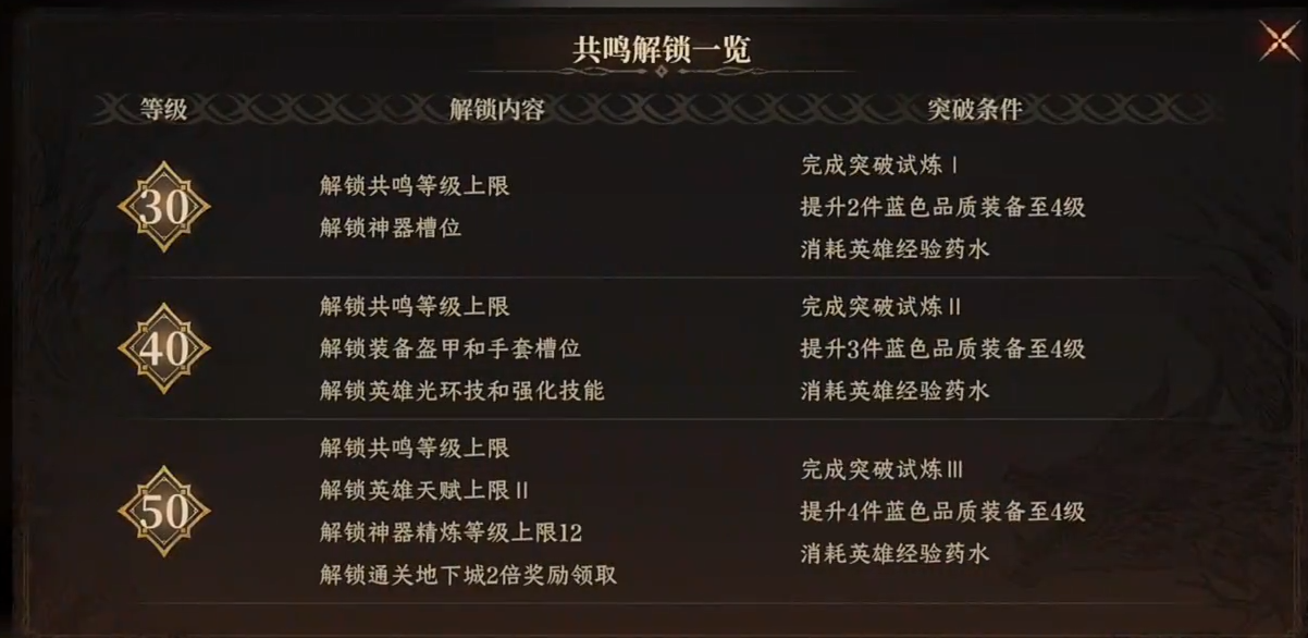 那么第一点就是人物的共鸣等级了,等级是提高战力的基础条件,每当等级有所提升时,就可以提高你所有角色的属性,比如生命力和攻击力等等。在游戏前中期时,需要进行提升等级来解锁其他战力提升的槽位,例如到达一定等级可以解锁装备和神器槽位,解锁天赋等级上限解锁装备精炼等级上限等等。