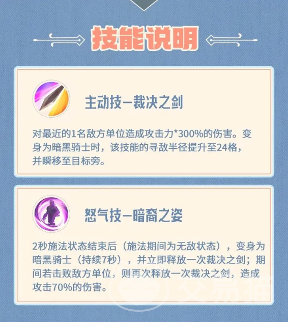 阿喀琉斯的技能设计充分体现了其攻防兼备的特点。他的主动技能“裁决之剑”能够对敌方单位造成高额伤害,并在变身为暗黑骑士后大幅提升攻击范围和机动性。怒气技能“暗裔之姿”则让他在短时间内变身为暗黑骑士,期间不仅免疫控制,还能在击败敌人后再次释放技能,形成强大的连锁输出。