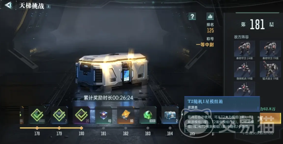 其实天梯挑战也能够让玩家不断的挑战关卡,获得对应的资源,包括模组箱。其实玩家在获得模组箱的时候,前期每突破5层天梯的话。就能够领到一个T2的模组箱。当玩家挑战到99层之后,每5层就可以获得两个模组箱。