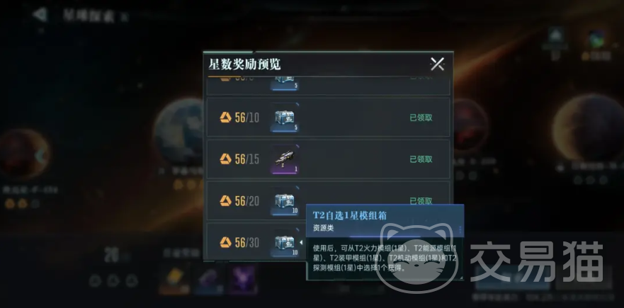 玩家想要获得模组箱的时候,可以进行星球探索,当玩家星球探索的等级达到30星的时候,就可以领到30个T2级别的模组箱。