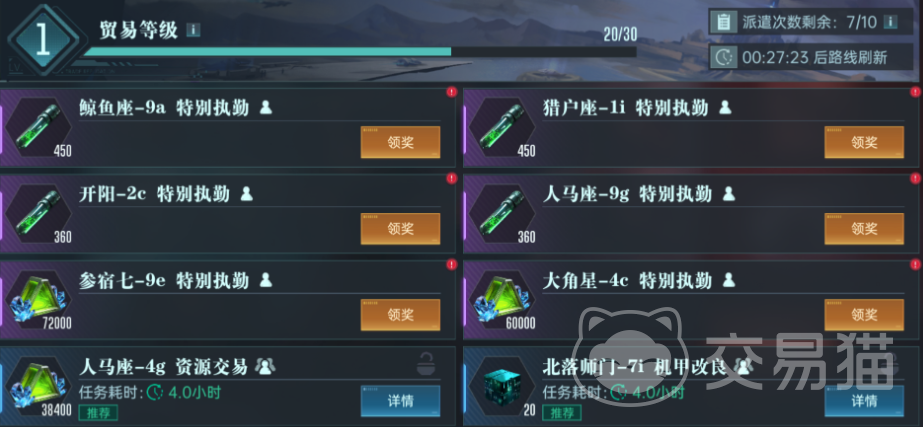 星际贸易是派遣英雄在星际间进行贸易,一旦成功的话,玩家将会获得城建的资源,装备升级,英雄升级等等资源。玩家每天有5次可以贸易的机会,这时候玩家直接选择高奖励的任务。