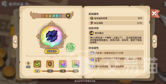 雷电属性的伤害是397,攻击间隔为0.95秒。技能有激光扫射,每相隔0.5秒就会有一个蟹钳,在目前的范围内,如果释放普通攻击就可以直接发射激光,并且会有25秒的持续时间。