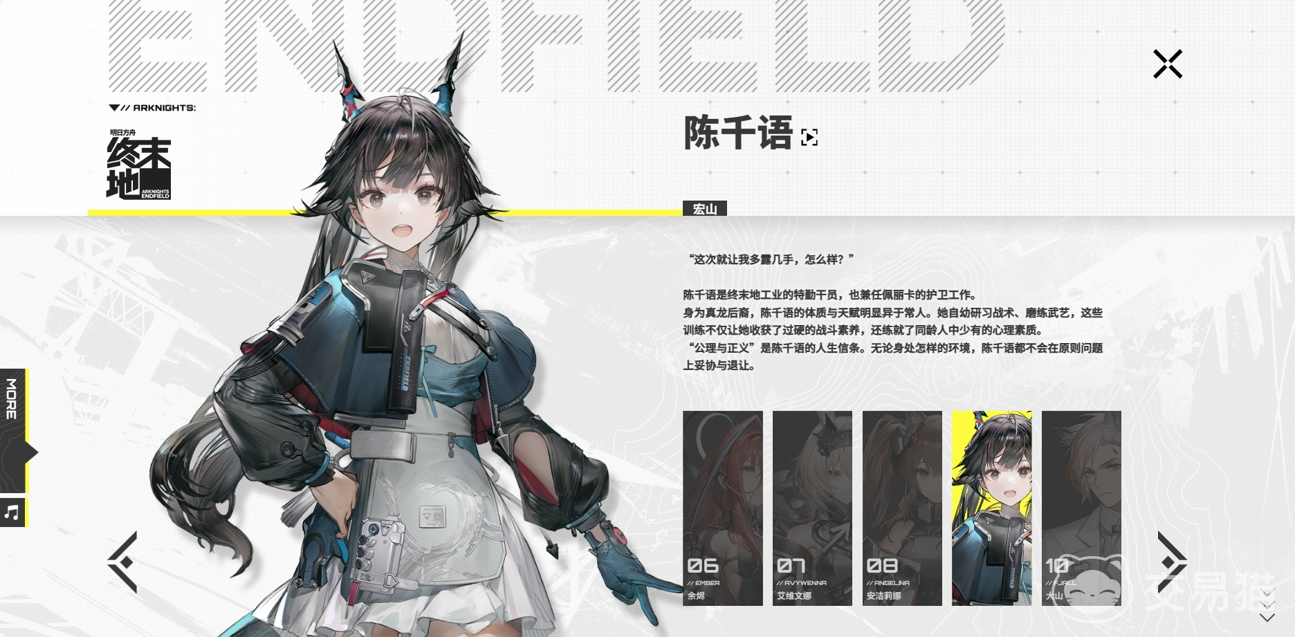 以上就是明日方舟终末地全角色的全部内容了,由于游戏中可用角色太多,本期内容无法全部一一介绍,小编介绍的这几个角色是游戏中比较重要的角色,玩家们在游戏中可以选择以上这几个角色来体验哦。