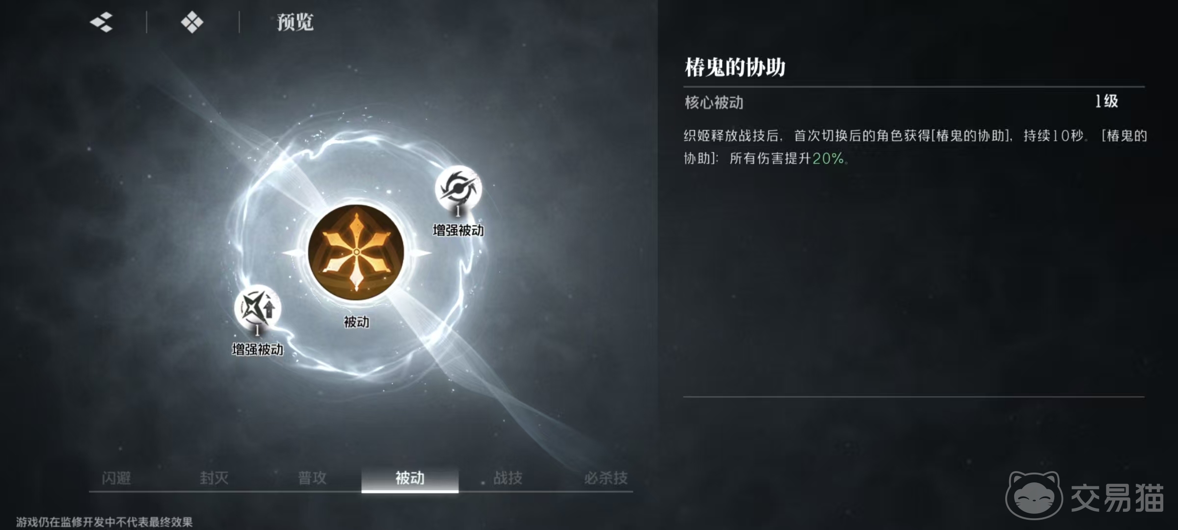 在被动技能方面,核心被动在释放战技后。首次切换后的角色。将获得椿鬼的协助效果,持续10秒钟。在此效果的加持下,所有伤害提升20%。如果能够利用好这一被动,那么就可以通过频繁切换的方式来使得主c获得很强的伤害加成效果。另外还有两个增强被动,使得椿鬼的协助额外提升当前角色攻击力,还有使井上织姬最大生命值提升等。