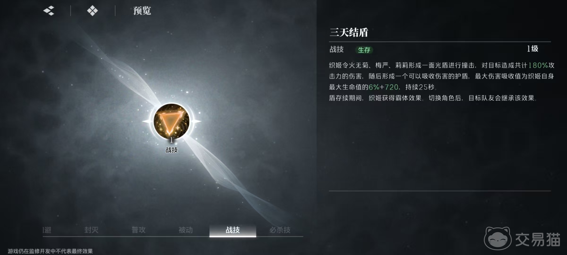 井上织姬的战技是三天结盾,形成一面光盾进行撞击,对目标造成伤害,随后形成一个可以吸收伤害的护盾。护盾最大伤害吸收值,和井上织姬自身最大生命值相关,在护盾存续期间内,井上织姬将获得霸体效果。如果此时切换角色,目标队友也会继承该效果,护盾持续25秒钟。这样就可以利用切换来使得其他的队友也获得霸体,在战斗中是非常有效的提升。