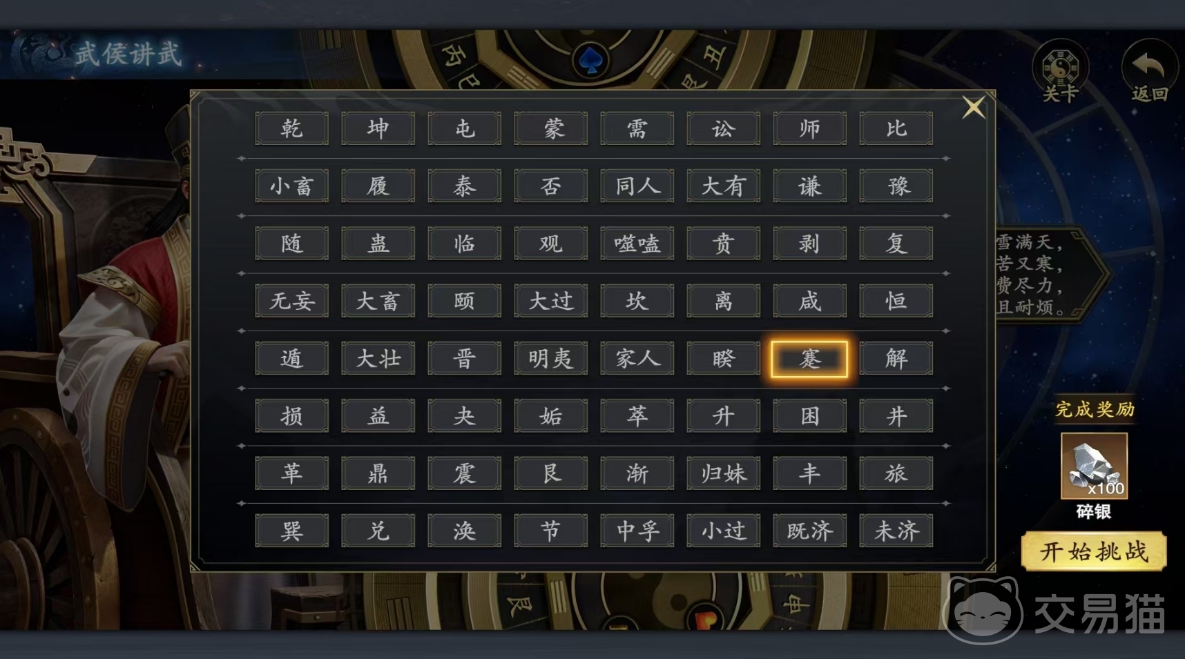 大伙能直接在主界面进入到战役模式中,目前该模式只开放了武侯讲武这一战役玩法,它以单机的形式进行,共设计了64关,每一关都需要玩家们使用指定武将来击败对手,并且在实战中有着回合数等方面的限制,玩家所能拿到的手牌也固定不变,所以在通关流程上会相对比较固定。