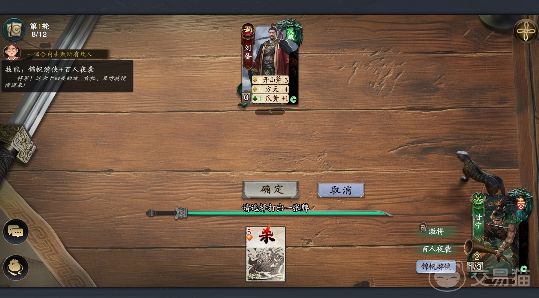 以乾关(第一关)为例,进入关卡后它会在左上角给出过关的要求,并会给出过关所需要用的武将技能的关键提示(关键的武将技能),玩家们只要按提示来合理地去利用甘宁的技能,拆掉刘备的爪黄马,就有足够的距离向刘备出杀来击败他。因此,关卡中的提示将会成为玩家们过关的关键,各位可不要忽略掉它。