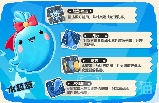 水蓝蓝是水系宠物,适合喜欢灵活操作,用控制技能打乱敌人节奏,施展多样战术的玩家,它的特性 “浸润” 相当实用,使用水系技能后,所有技能释放所需的能量将会降低,战斗中能频繁释放技能,掌握主动权。