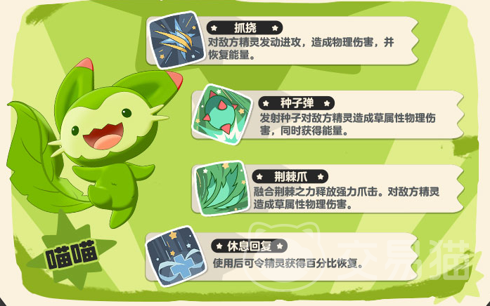 喵喵属于草属性,适合喜欢均衡玩法,注重生存与续航的玩家。它的特性 “氧循环” 很实用,释放草系技能时可以回复部分生命值,战斗中能一边打一边回血,“打不死的小强” 说的就是它,而且喵喵技能多样,能攻能守。