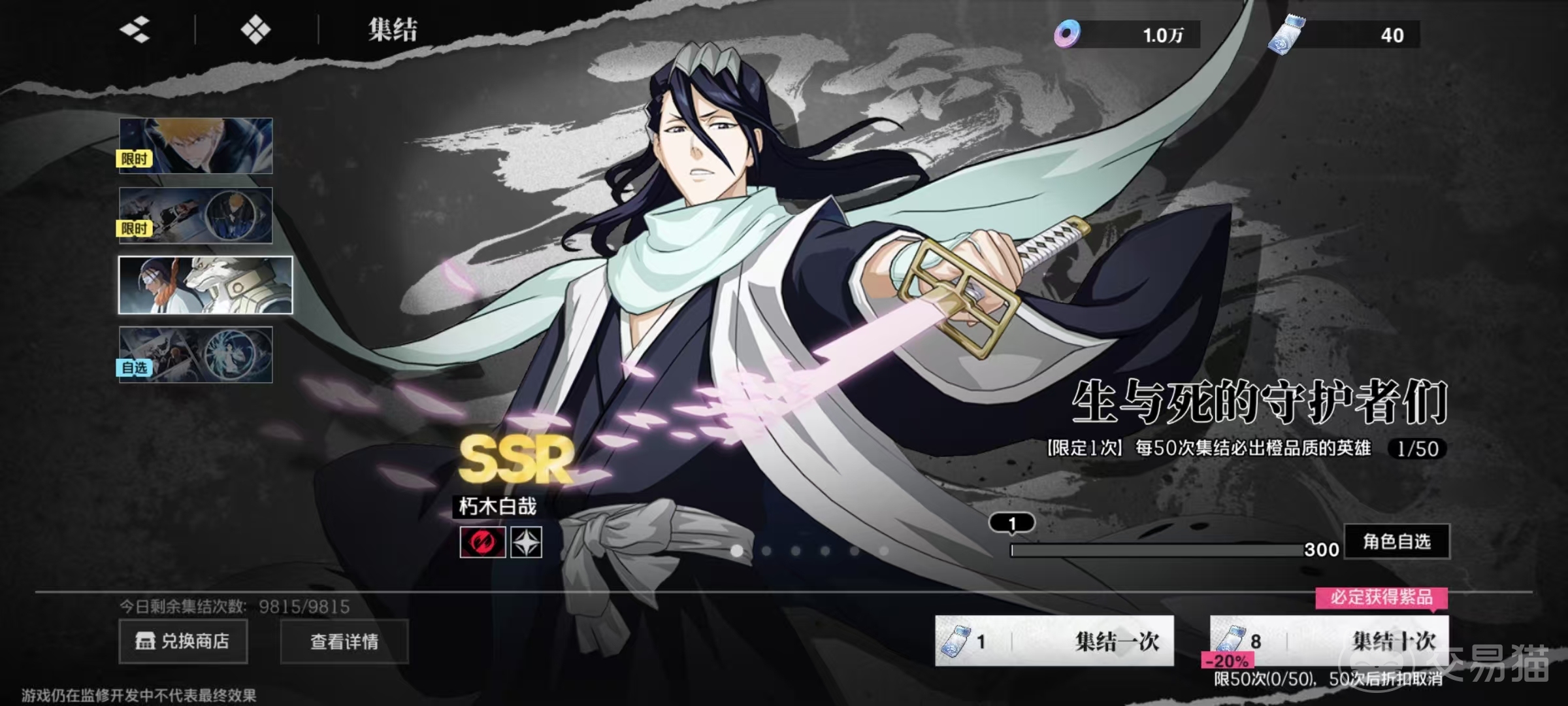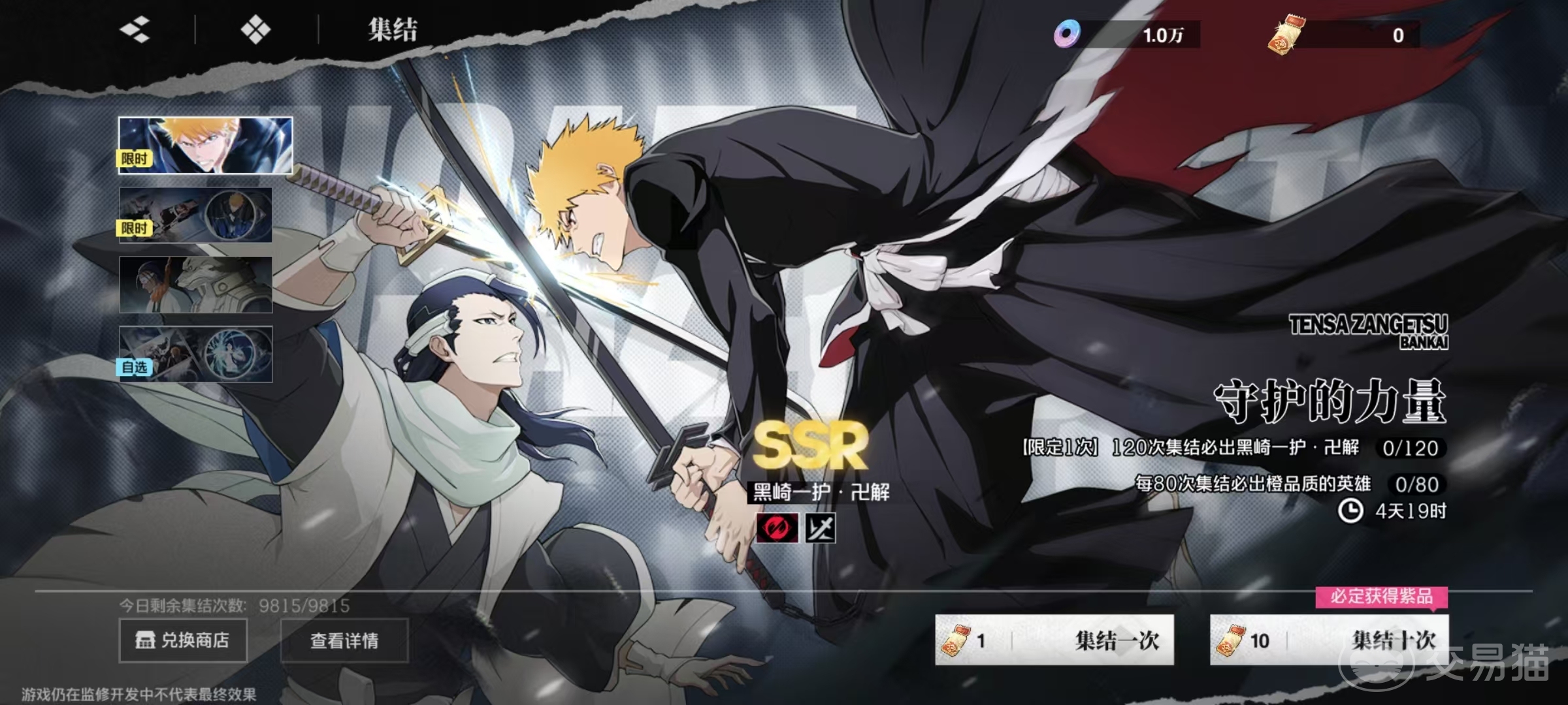 还有一个保底是最多进行80次抽取,在常驻池中必定能够获得ssr品质角色注意。这里获取的是角色而不是刻印,所以大家根本不用担心大量抽取后还没有获得角色的问题,这款游戏目前综合出货的几率还是比较高的。再来看一下限定池,限定池中出现的英雄并不是固定的,根据测试中的情况来看,首次出现的限定英雄就是黑崎一护万解,这也是一个很强的人物,非常值得大家去抽。