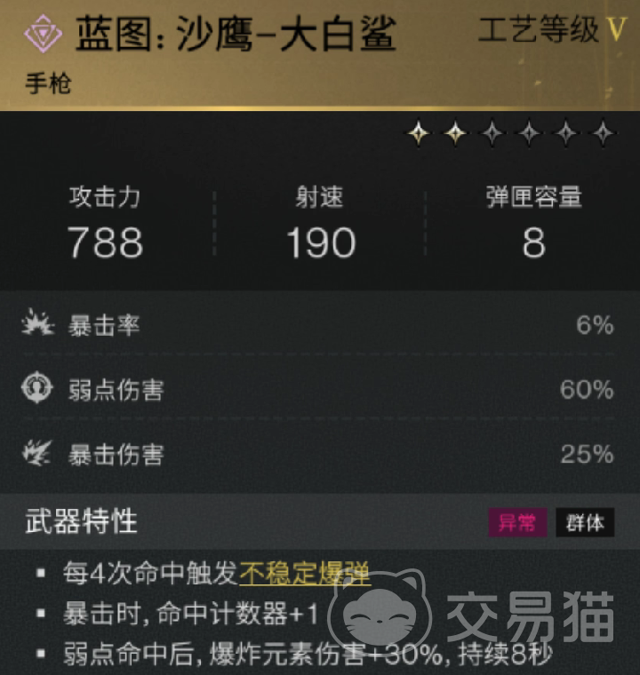 沙鹰大白鲨手枪的射速是190次每秒,不过它的弹夹容量是特别少的。只是它作为手枪的话,有这么多弹夹容量也是可以合理的运用的,并且能够面对众多的场景。如果玩家将它跟其他的装备和模组搭配在一起的话,它的暴击率跟暴击伤害会有所提升。