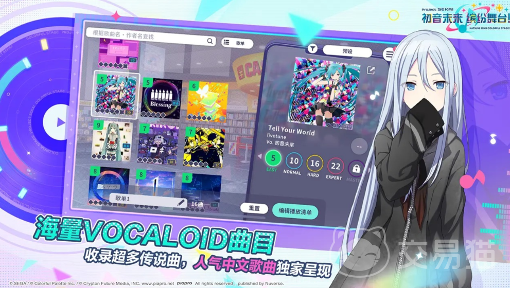 对于音游老手和有经验的玩家们,初音未来缤纷舞台还在游戏中设置了多种难度级别的歌曲,这些歌曲都是拥有版权的经典的虚拟歌手们的代表作品,并且游戏中的所有歌曲均设置了适合超级玩家的MASTER难度,给喜欢挑战高难度的玩家准备了惊喜。