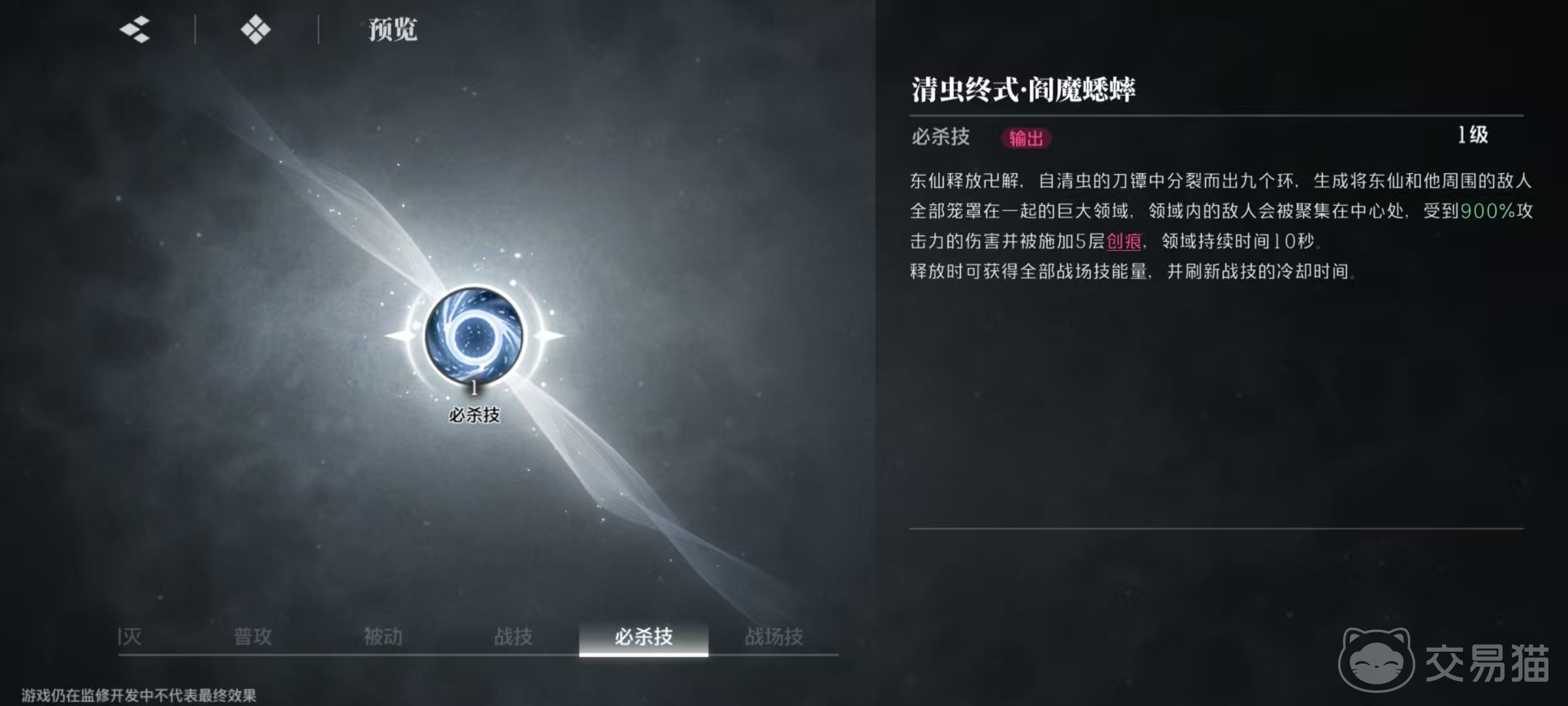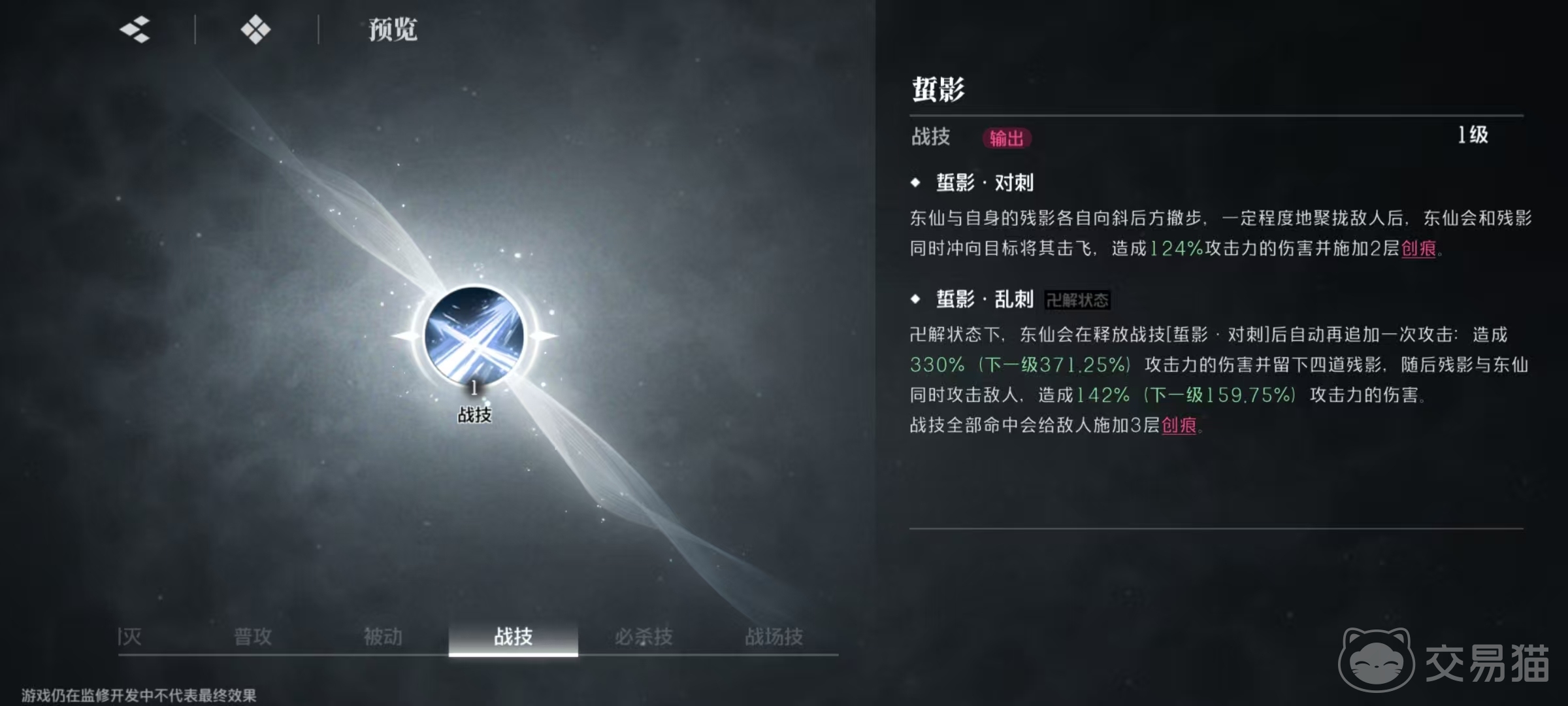 战场技飞蝗群刺,激活时默认给全队提供30%突袭伤害加成,出现在战场上进行协同攻击。还有一个闪翅斩,快速移至敌人身边进行瞬劈,造成伤害并施加两层创痕,在经过短暂延迟之后,轨迹上就会涌出强大的灵压,对轨迹上的敌人再次造成伤害,并使所有敌人身上的创痕层数提前爆发出来,如果敌人处于必杀技的领域内,那么结算创痕伤害时不会清除身上的创痕层数。