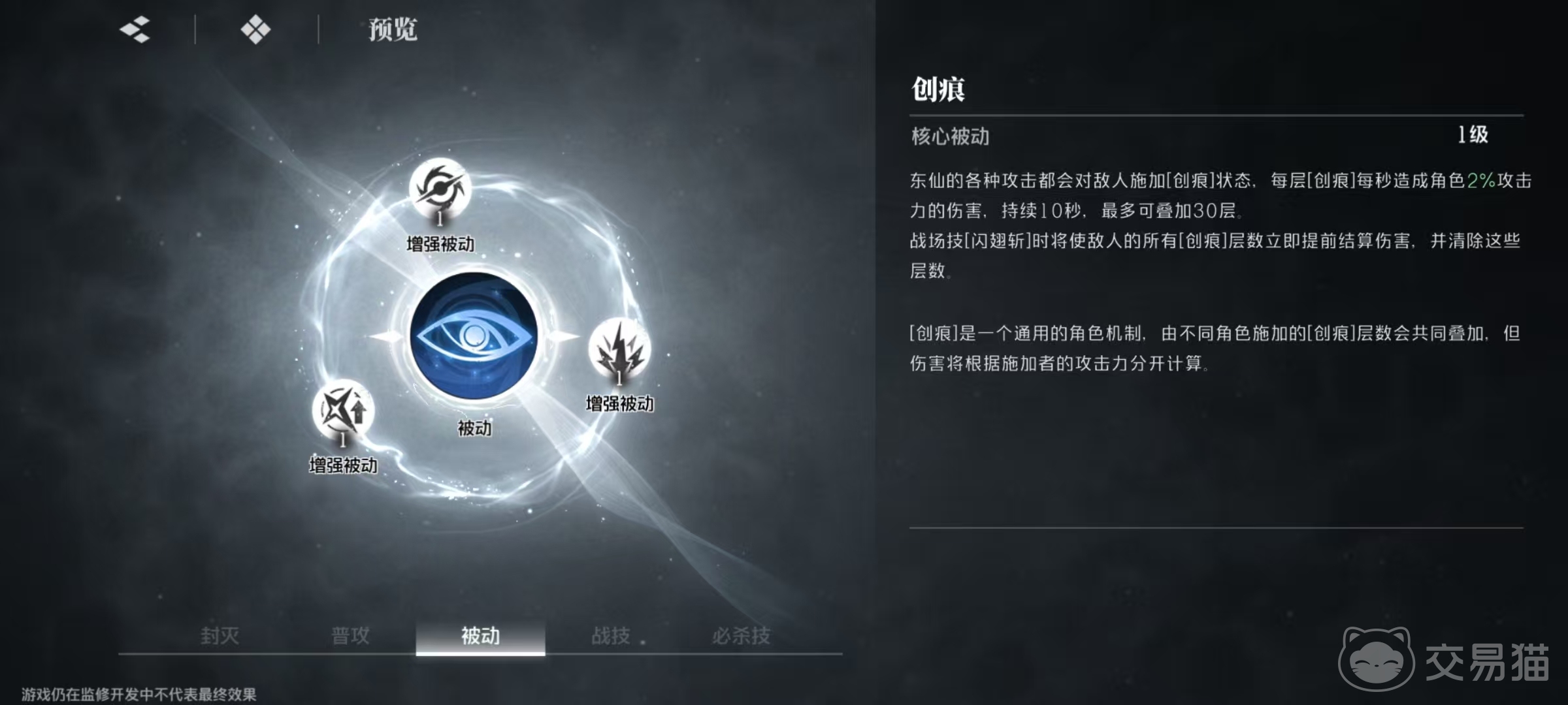 先来看一下东仙要的核心被动创痕,各种攻击都可以对敌人施加创痕状态,每层创痕每秒可以给角色造成2%攻击力的伤害,持续10秒钟。虽然单层不高,但是最多叠加到30层,这样就比较可观了。利用战场即闪可以将敌人身上所有的层数立即提前结算伤害,这样就能打出比较可观的瞬间爆发。另外还有增强被动效果,例如在攻击被添加了创痕的敌人时,获得额外暴击率加成,任意战场技在命中目标时都会使敌人的突袭抗性降低。