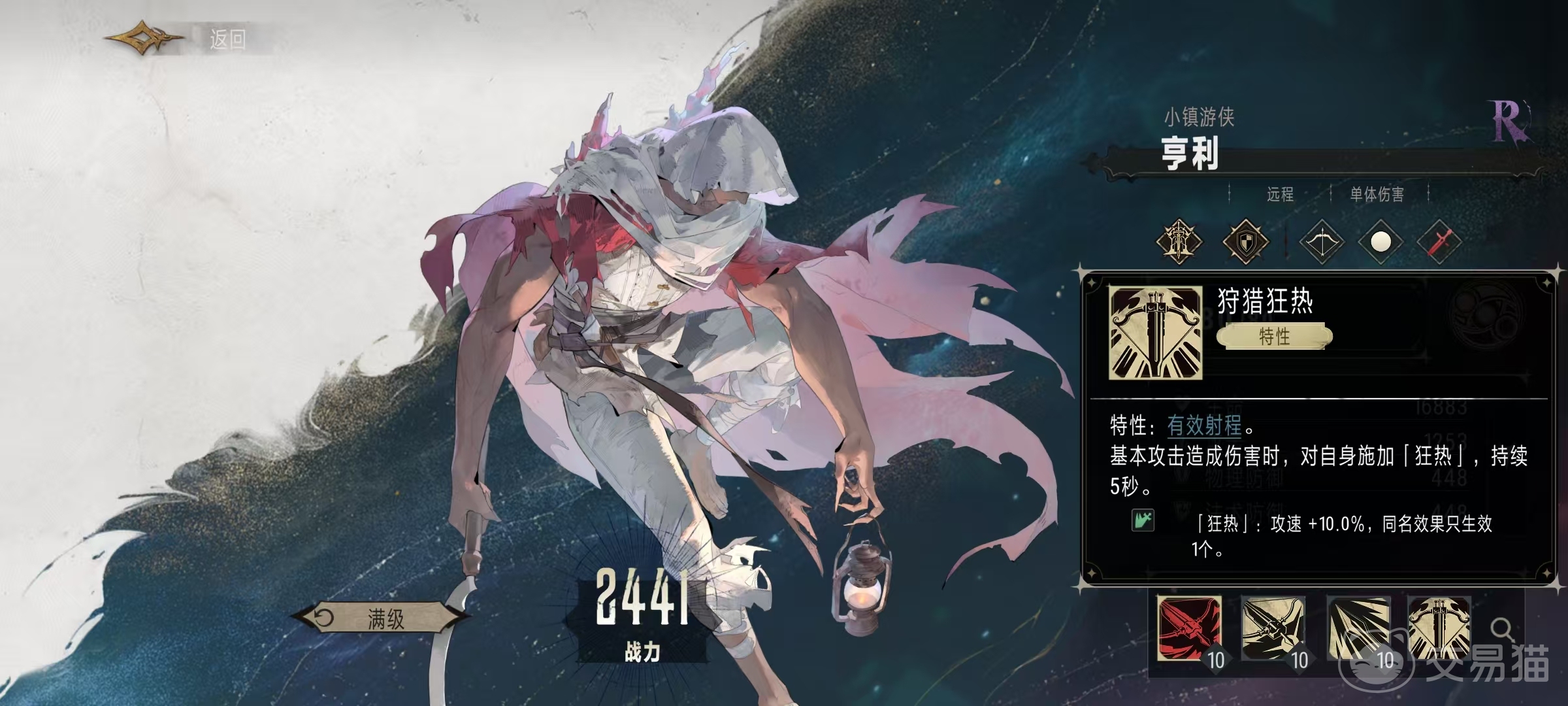 亨利还具有一个特性狩猎狂热,这个特性为有效射程,也就是当造成伤害的时候会根据射程以及目标的远近,来判断不同伤害加成,距离越远造成的伤害也就越高,距离越近造成的伤害越低,上下会有50%的浮动。所以说如果能选对攻击目标,达到较远的程度,伤害加成所带来的优势也是比较明显的。另外这个特性还在基本攻击造成伤害时,会自身施加一个狂热效果,持续5秒钟,狂热状态下攻速可以增加10%,同名效果只生效一个。这就意味着除了狂热之外,还可以享受到其他攻速加成技能所带来的提升。
