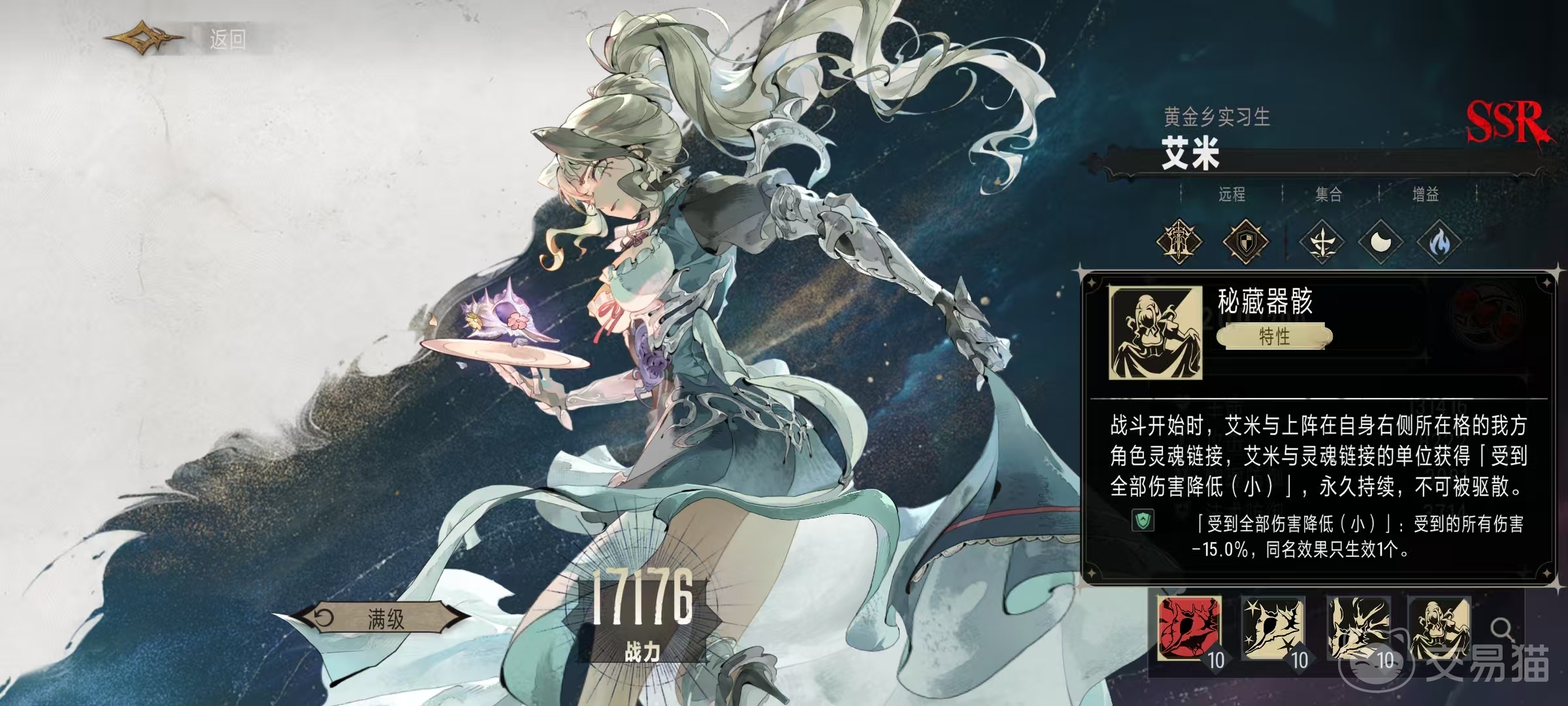 战技是罪身的共犯,艾米或者是灵魂连接的单位,生命值首次低于50%的时候,艾米和灵魂连接单位将会共同恢复艾米最大生命值38.5%的血量。这也就意味着只要和其他单位建立起灵魂连接,那么生存方面就提供了很大的保障。而灵魂连接则是自身特性所带来的额外效果。在战斗开始时,艾米就可以与阵容中自身右侧所在格的我方角色进行灵魂连接,艾米和灵魂连接的单位,都会受到伤害降低影响,此效果是永久持续,不可被驱散。该效果使得两个角色受到的所有伤害降低15%,同名效果只能生效一个。