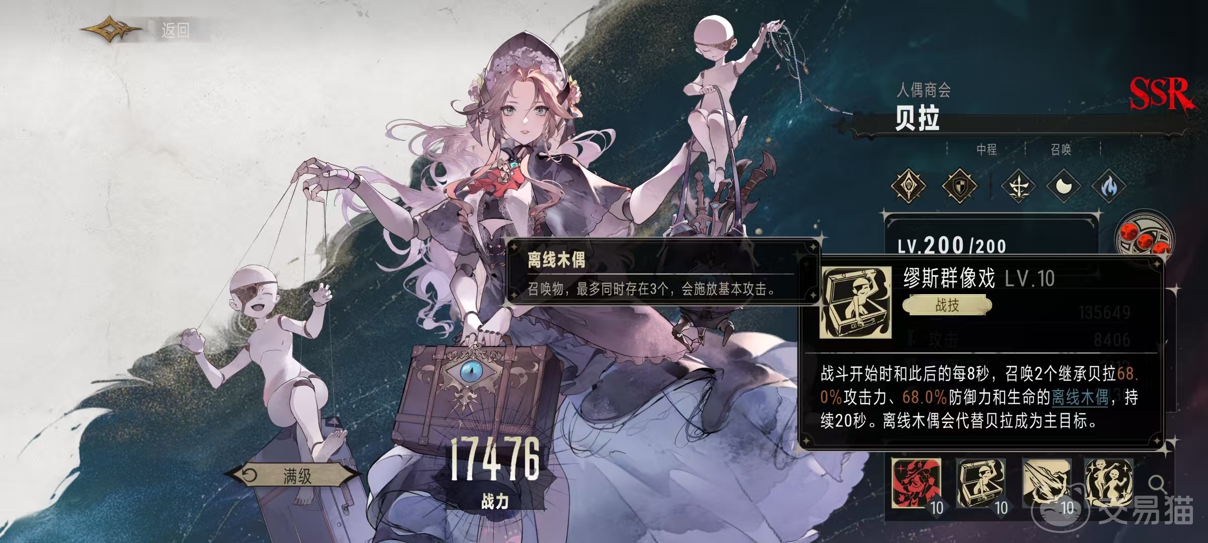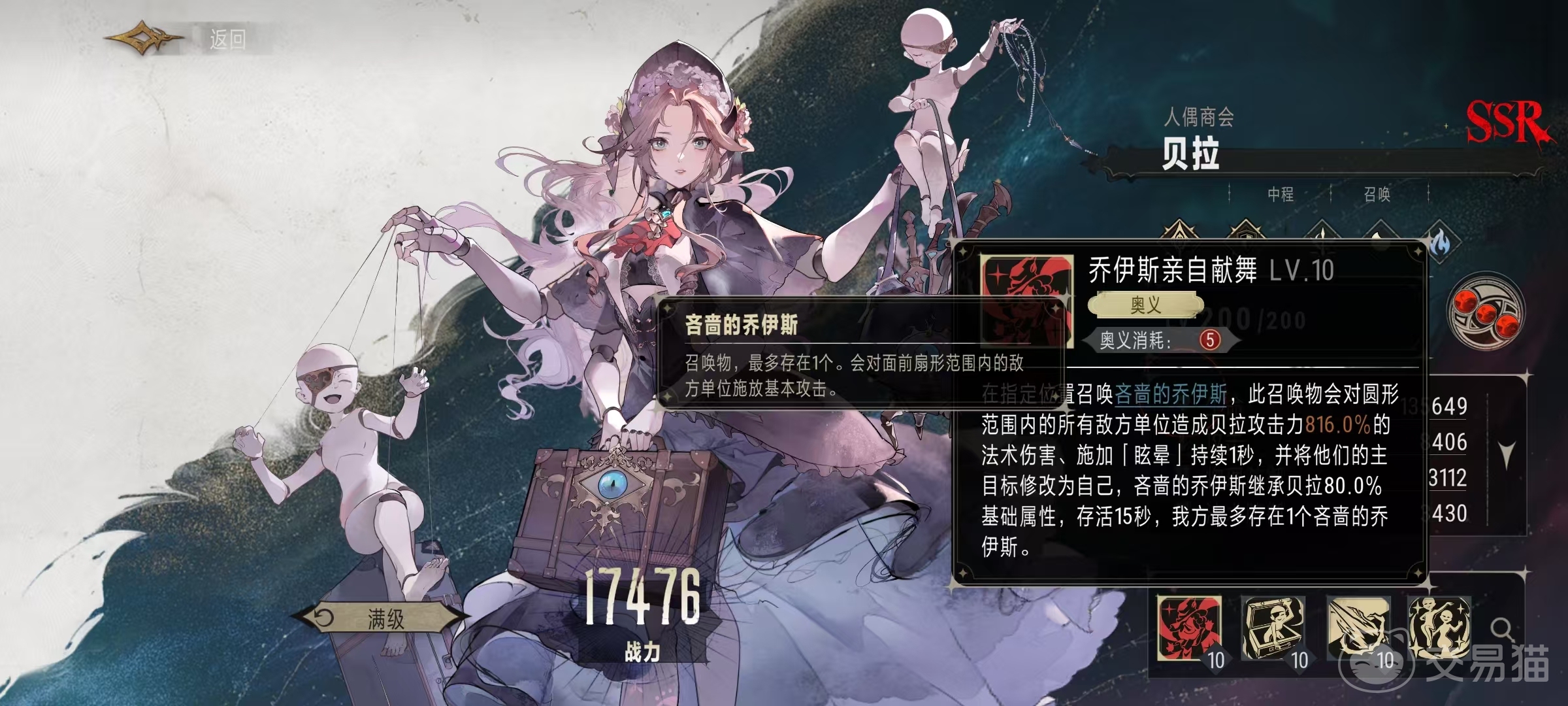 战技效果是在开始时,和此后的每8秒钟,都会召唤两个继承贝拉68%攻击力、68%防御力和生命值的离线木偶,持续20秒。提线木偶替代贝拉成为主目标,召唤物最多同时存在三个,会使用基本攻击来打出伤害。除了提高伤害之外还可以替代成为目标,这样对方在攻击的时候,贝拉的生存能力就会提升很多。自身的奥义技能效果是在指定位置召唤吝啬的乔伊斯,这个召唤物会对圆形范围内的敌方单位造成高额法术伤害,同时添加持续一秒钟的眩晕效果,将敌方单位的主目标修改成自身。吝啬的乔伊斯继承贝拉80%的基础属性,存活15秒钟,我方最多同时存在一个吝啬的乔伊斯。