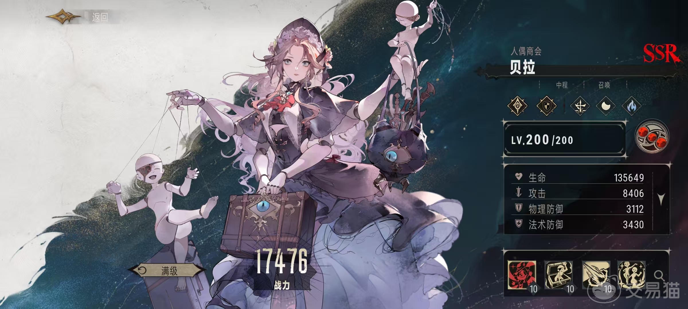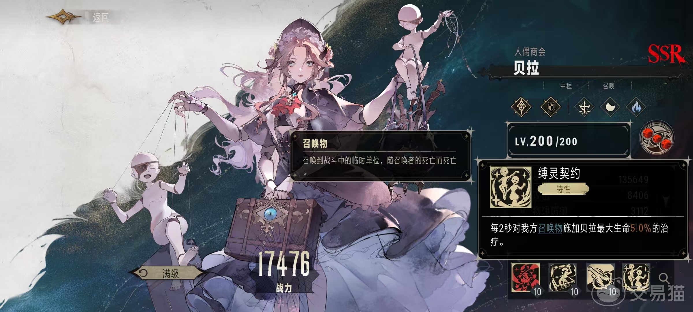 贝拉擅长在游戏中通过召唤来打出各种效果,它是属于夜族阵营中型角色,月像是残月。基本攻击对主目标造成204%的法术伤害,从基本攻击伤害比例来看,在所有角色中都是比较出色的一个。它的特性是缚灵契约,每两秒钟就可以对我方召唤物进行一次最大生命值5%的治疗,召唤物指的是我方所有上阵角色召唤出来的临时单位,召唤者死亡后,召唤物也会同样消失。