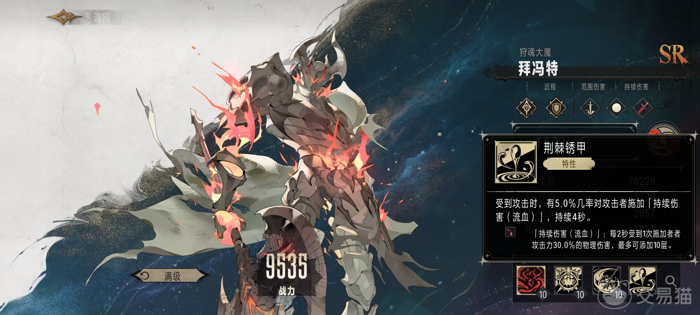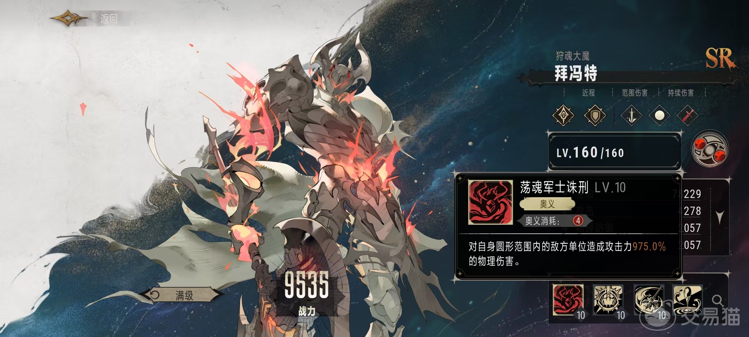 奥义技能荡魂军士诛刑,消耗4点奥义点数,释放之后对自身圆型范围内的敌方单位造成975%攻击力数值的物理伤害。这个奥义技能使用出来可以给敌方造成极大的杀伤,不过攻击范围是硬伤。特性是荆棘锈甲,当拜冯特受到攻击时,有5%几率对攻击者施加持续伤害,也就是流血效果,持续4秒钟。持续伤害影响下的目标,每两秒钟会受到一次施加者30%攻击力的物理伤害,虽然看上去并不高,但是可以叠加到10层,叠加到满层之后仅仅是流血所造成的伤害都已经非常可观了。