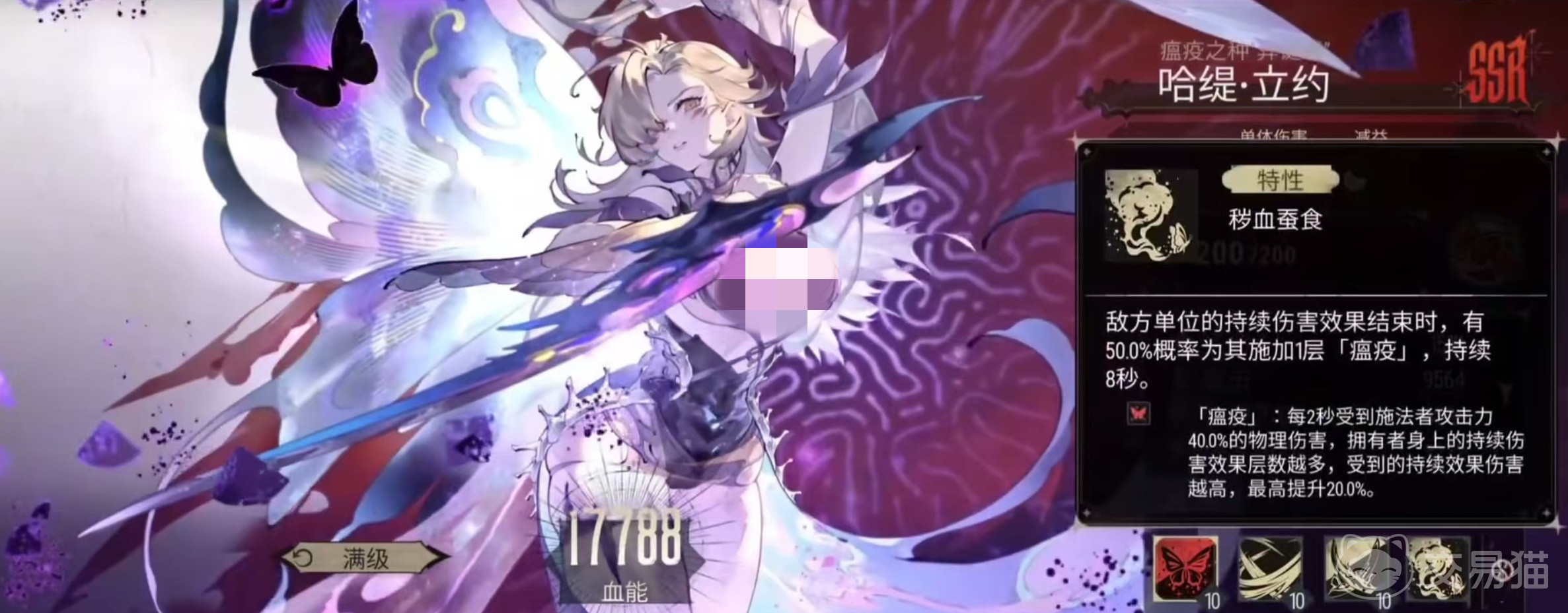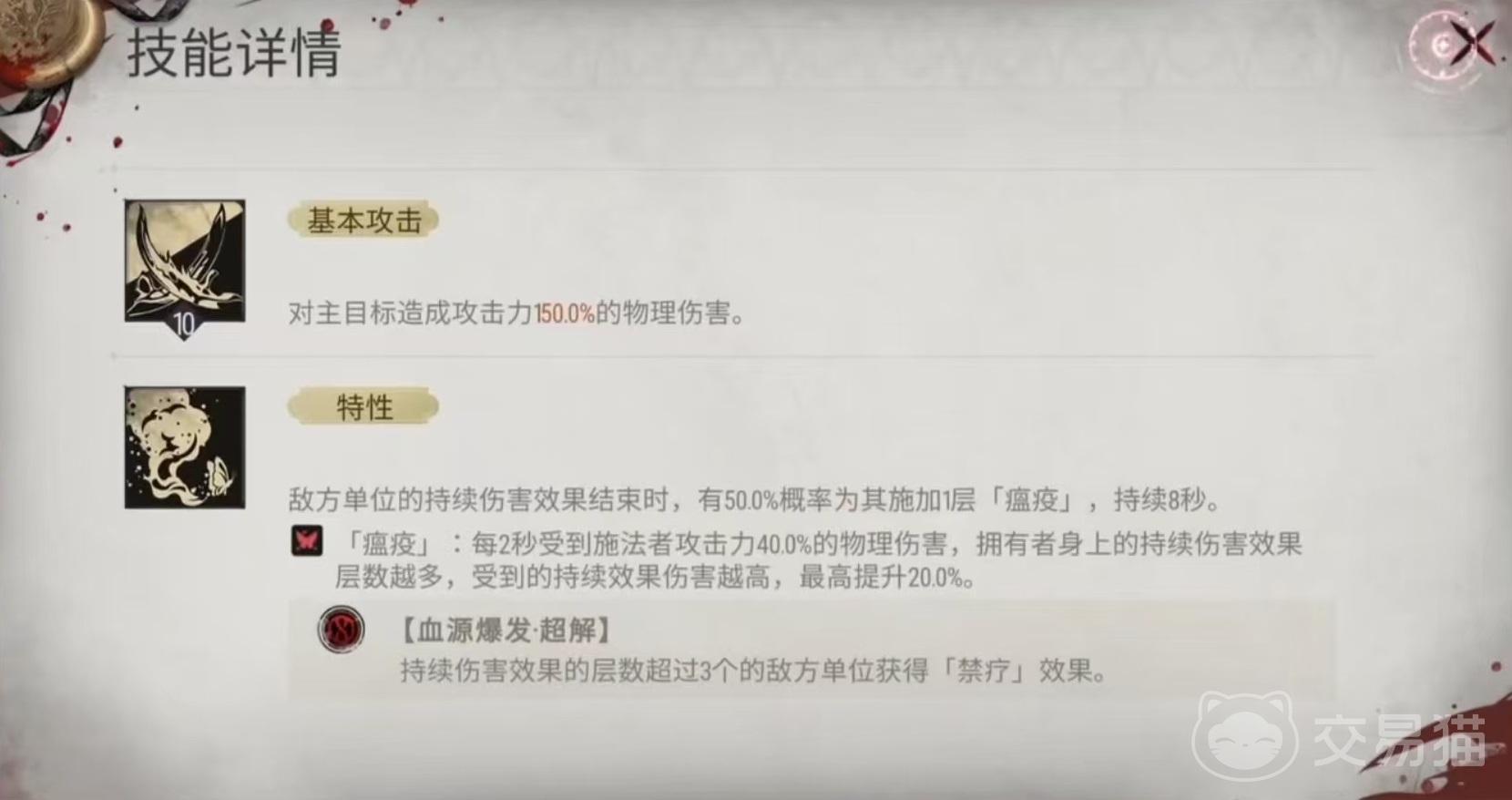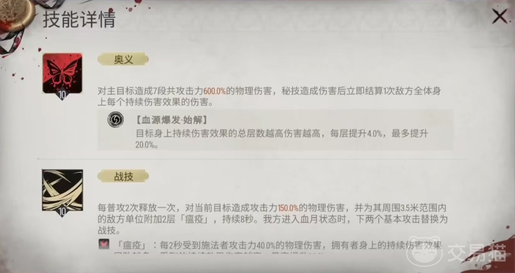 这里只要是敌方身上的持续伤害效果结束都有几率触发,例如流血或者是其他持续伤害都是如此。战技是每普攻两次就可以释放一次,对当前目标造成150%攻击力的物理伤害,同时为周围3.5米范围内的所有敌方单位,都附加两层瘟疫,持续8秒钟。我方进入血月状态时,下两个基本攻击会替换为战技。附加的瘟疫和上面所说的效果是完全一样的,所以哈缇立约本身也可以带来很高的持续伤害。