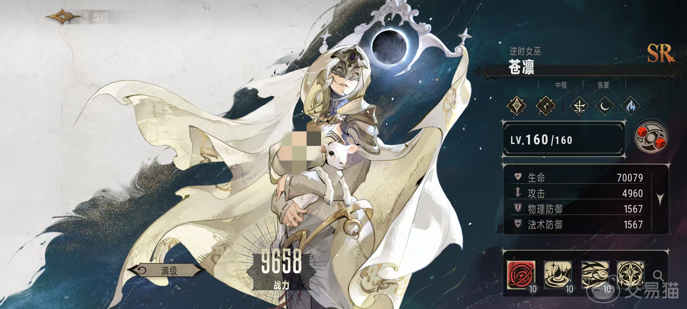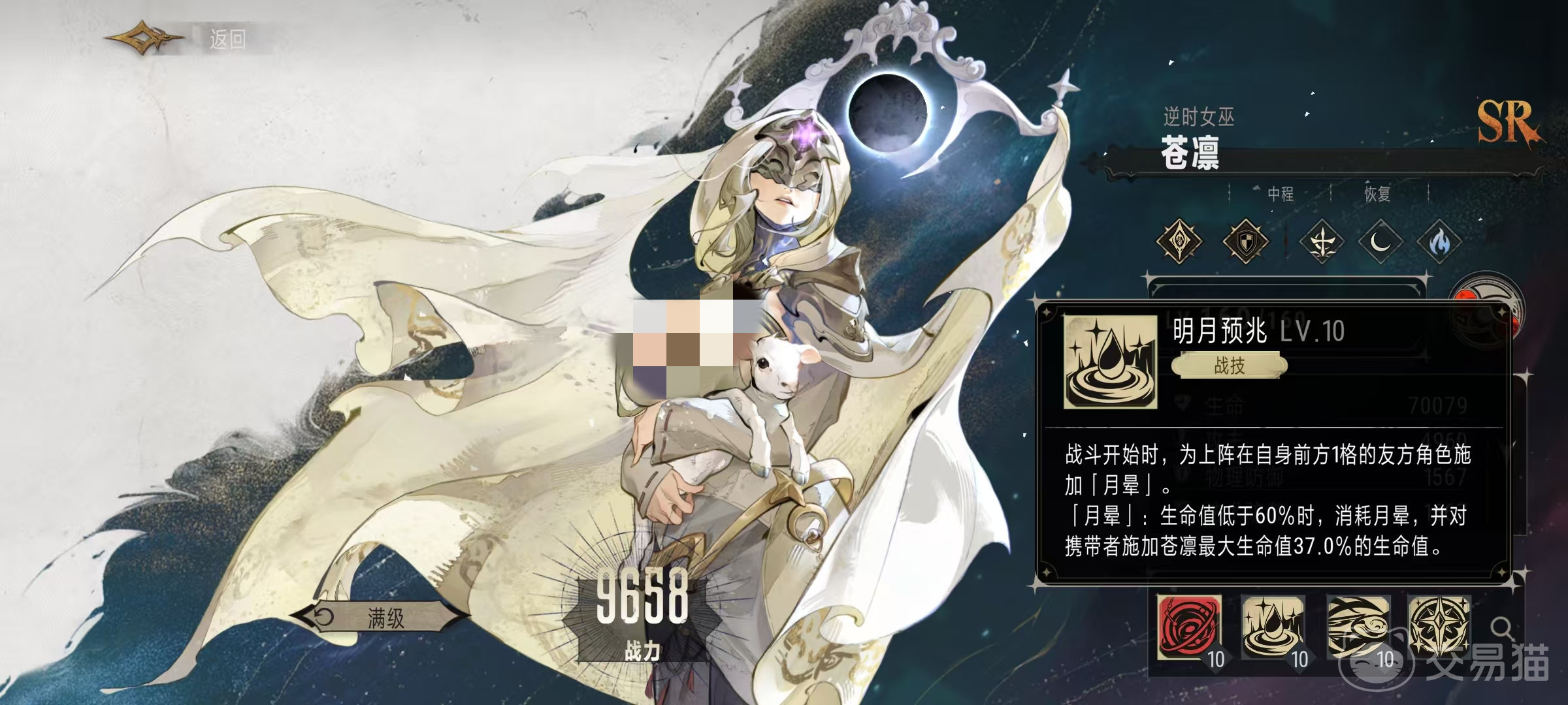 该角色在游戏中的称号是逆时女巫,它是属于夜族阵营,是一个可以用不同技能辅助队伍作战的角色,在射程方面为中程,擅长进行恢复,月相是新月。基本攻击秘泉,可以对主目标造成180%攻击力数值的法术伤害。战技明月预兆。战斗开始时为上阵在自身前方1格的友方角色施加月晕效果。月晕效果是当生命值低于60%时,会将月晕消耗掉,对携带者施加一次治疗,治疗量按照施法者最大生命值37%来进行计算。