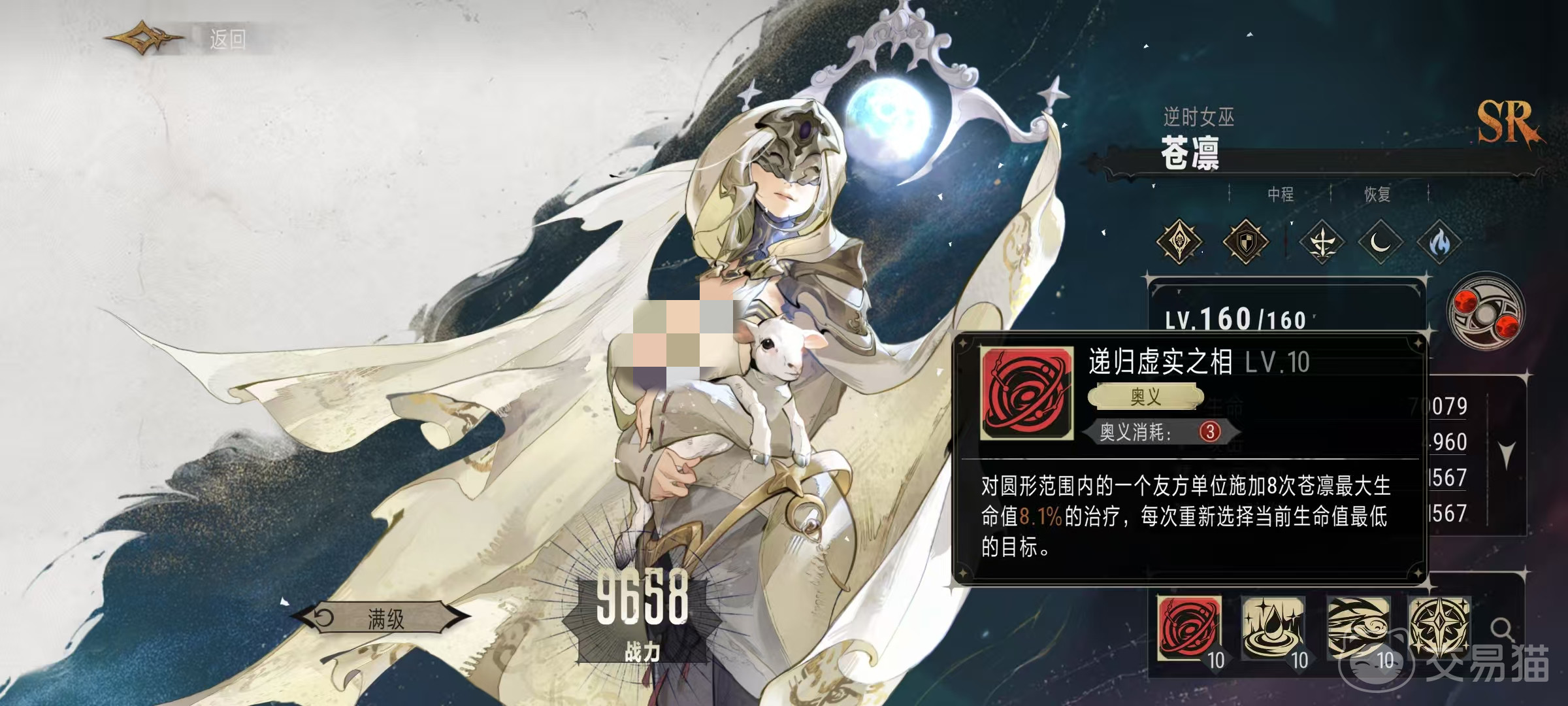 最后是自身的大招,也就是奥义技能递归虚实之相,需要消耗三点奥义点数,对圆形范围内的一个友方单位施加8次治疗。每次治疗量按照最大生命值8.1%计算,但是这8次并不是作用在一个目标上,而是自动选择当前生命值最低的目标。例如第1个选中的目标如果在接受治疗之后血量提升了上来,那么接下来的治疗就会再选择目前最低的进行治疗,所以这个技能使用起来还是非常有不错的。