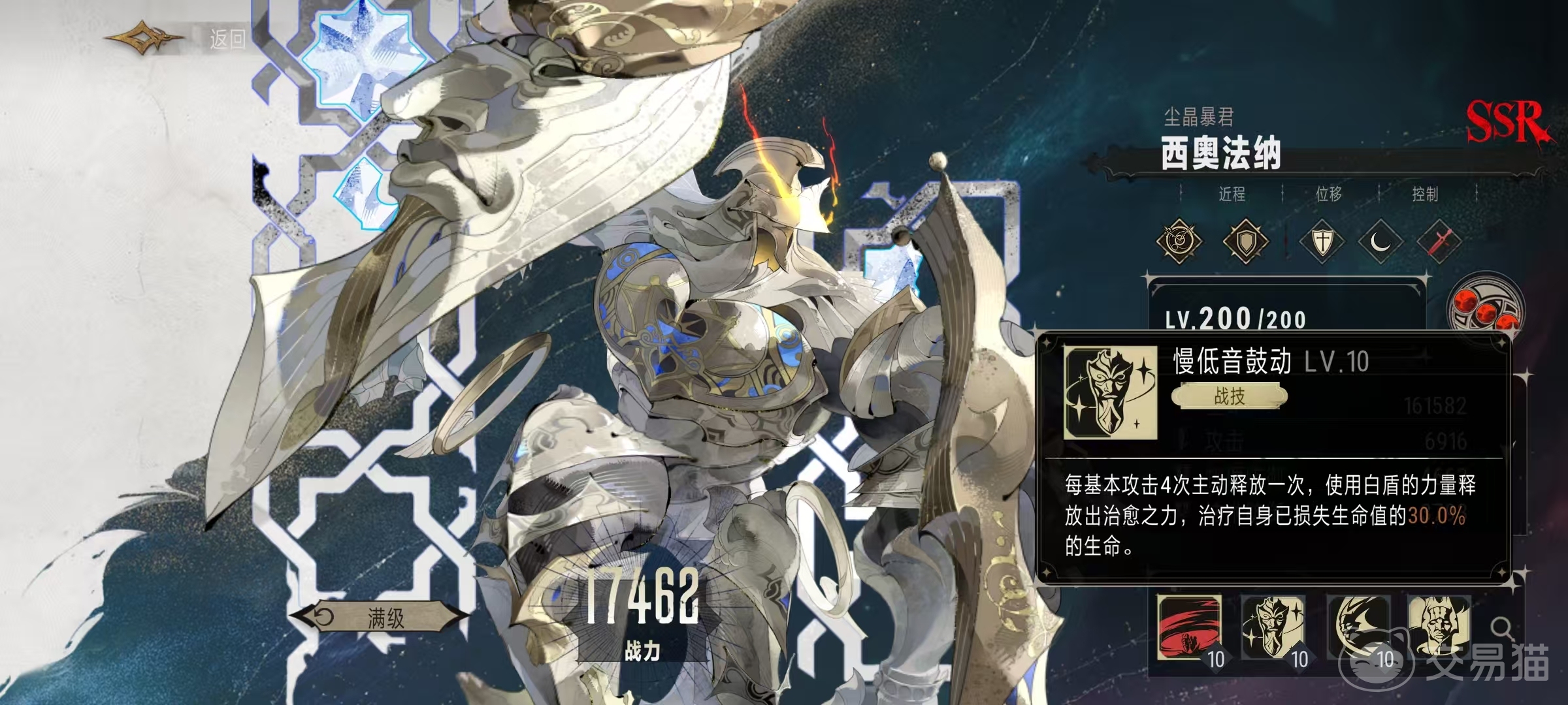 普通攻击冲撞,对主目标造成188%攻击力数值的物理伤害。战技慢低音鼓动,每进行4次普攻,就可以普通释放一次,使用白盾的力量释放出治愈之力,按照自身当前已损失生命值的30%来进行治疗。奥义技能信仰壁冠之跃,对指定位置进行一次位移,到达后以自身为圆心,周围圆形范围内的敌方单位都会受到525%攻击力的物理伤害,此后自身进入到10秒的守护状态。在此状态下对范围内敌人施加嘲讽,并获得中级物理伤害降低效果。