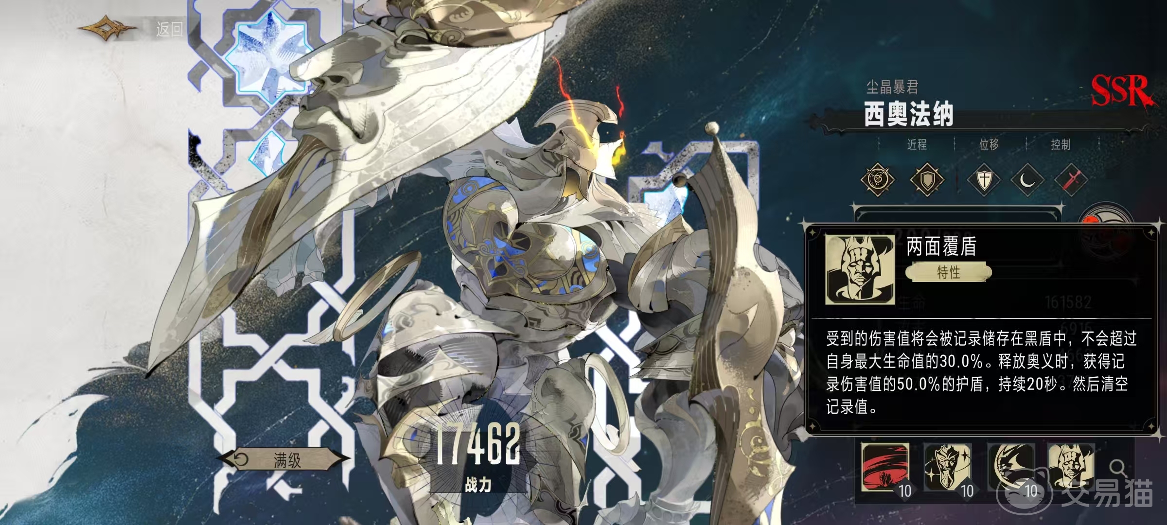 西奥法纳的特性是两面护盾,它在战斗中所受到的伤害值会记录储存在手中的盾牌中,不超过自身最大生命值上限的30%。在释放奥义技能时,会将记录伤害值的50%转换成护盾,添加到自己身上。该护盾持续20秒钟,然后将所有记录值清空,也就是说如果自身受到了100点伤害,那么会被记录起来,而且按照50%也就是50点来生成护盾,受伤越高护盾也就越厚。