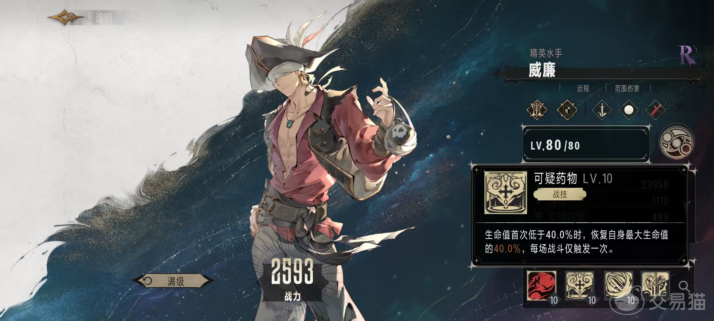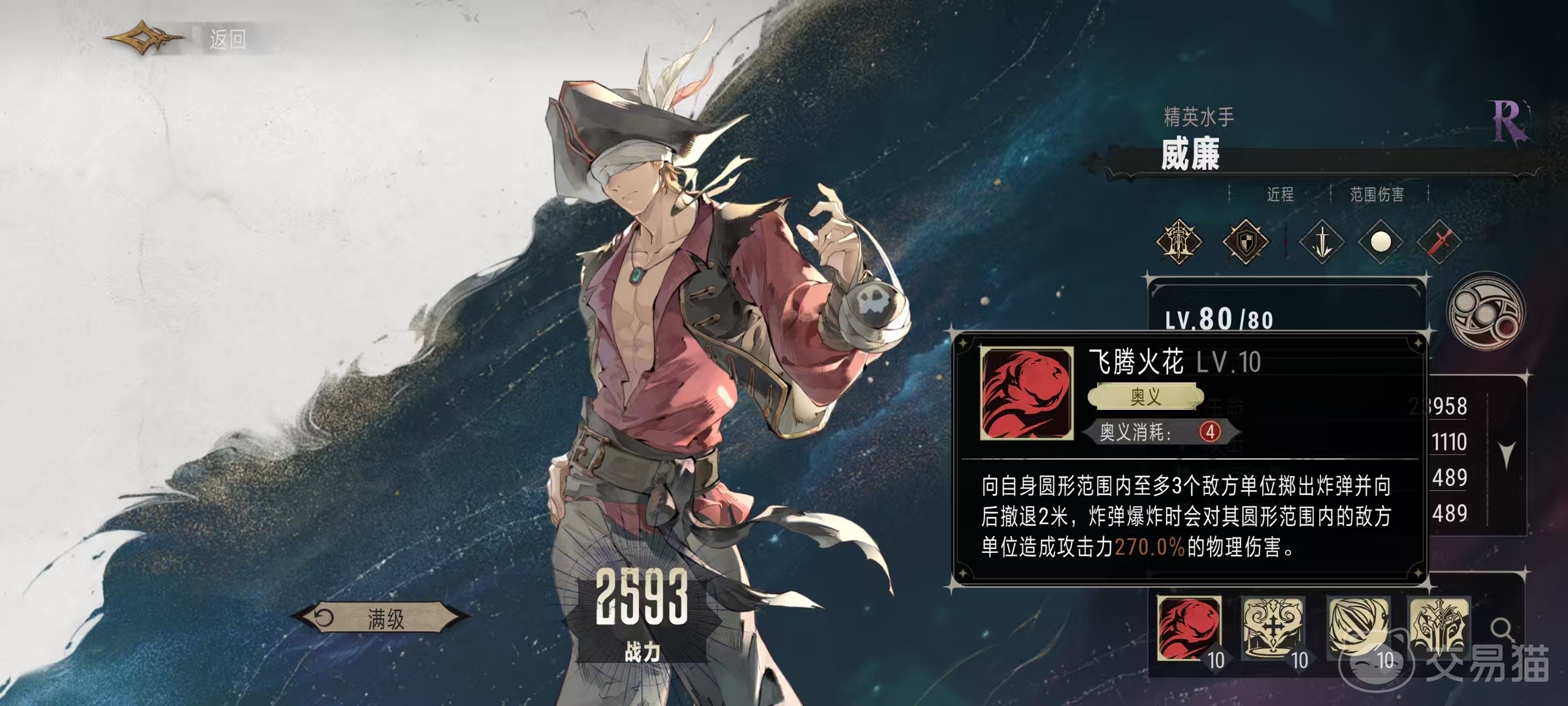 战技是可疑药物,当威廉生命值首次低于40%的时候就会生效,恢复自身最大生命值的40%,每场战斗只能触发一次。这个特点就可以使其能够放到前排去吸收一定的伤害,所以可分担前排其他英雄承受的伤害。奥义技能飞蓬火花,向自身圆型范围内最多三个敌方单位投掷出炸弹,并向后撤退两米。炸弹爆炸时,会对圆形范围内的敌方单位造成270%的物理伤害。