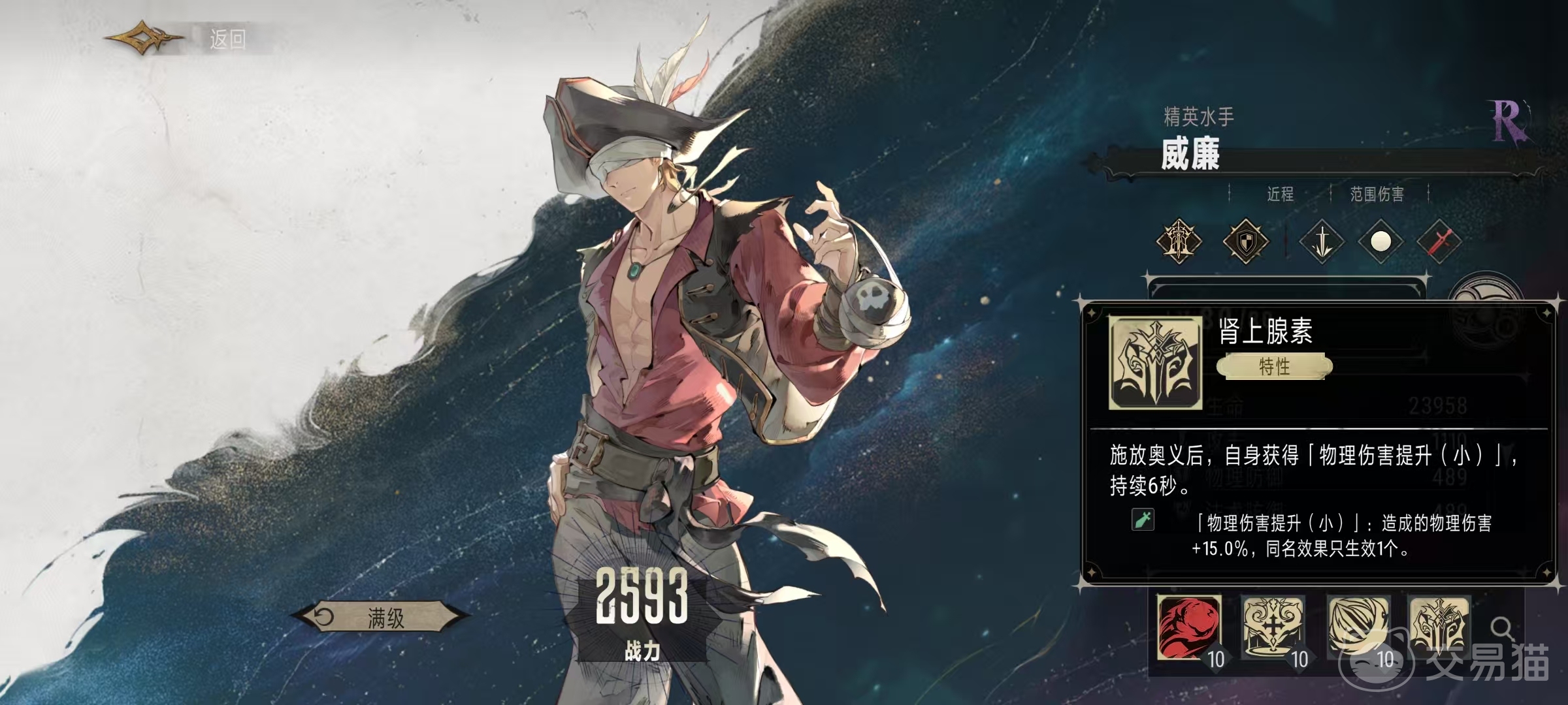威廉在游戏中的称号是精英水手,它是属于王国阵营中型单位,能够造成近战范围伤害。自身的普攻是近身战,对主目标造成128%攻击力的物理伤害。一个特性是肾上腺素,在释放奥义技能后,自身可以获得一个小型的物理伤害提升效果,持续6秒钟。该效果能够增加15%的物理伤害属性。如果和其他同名效果一起出现,那么只能生效一个。